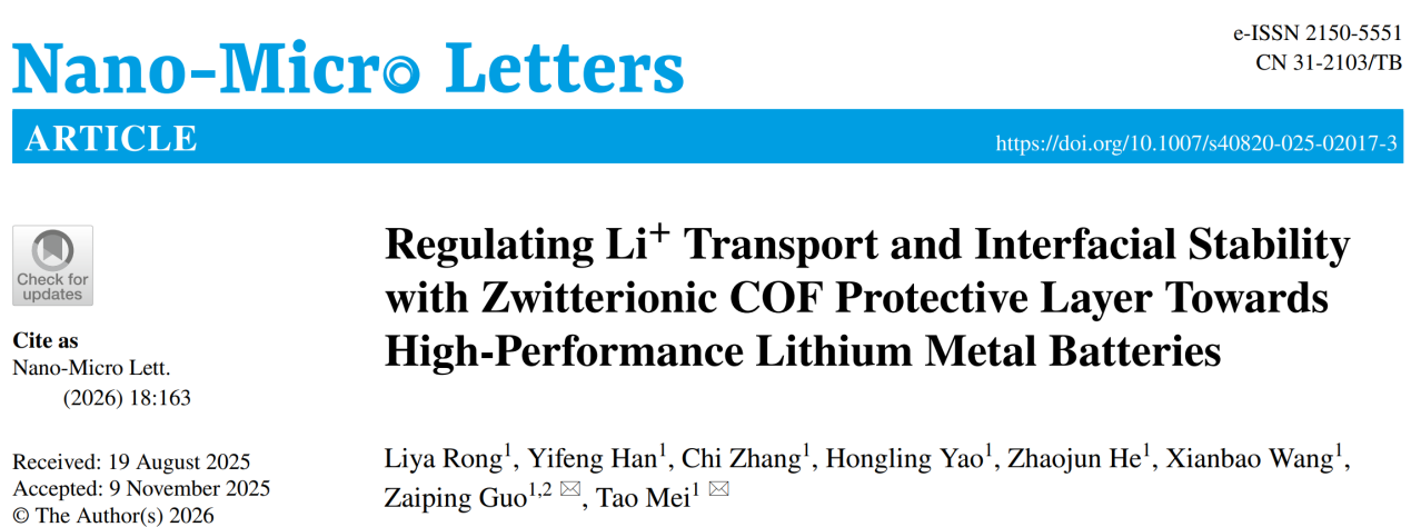 近日,太阳成集团tyc33455梅涛教授团队在国际顶级期刊《Nano-Micro Letters》(IF=36.3,在JCR纳米科技、材料科学和物理应用三个学科均位列Q1区前5%,其中纳米科技排名全球第2)发表题为《Regulating Li+ Transport and Interfacial Stability with Zwitterionic COF Protective Layer Towards High-Performance Lithium Metal Batteries》的研究成果。太阳成tyc33455cc为第一单位,2023级博士研究生戎丽雅为论文第一作者,香港城市大学郭再萍院士、太阳成tyc33455cc梅涛教授为共同通讯作者。