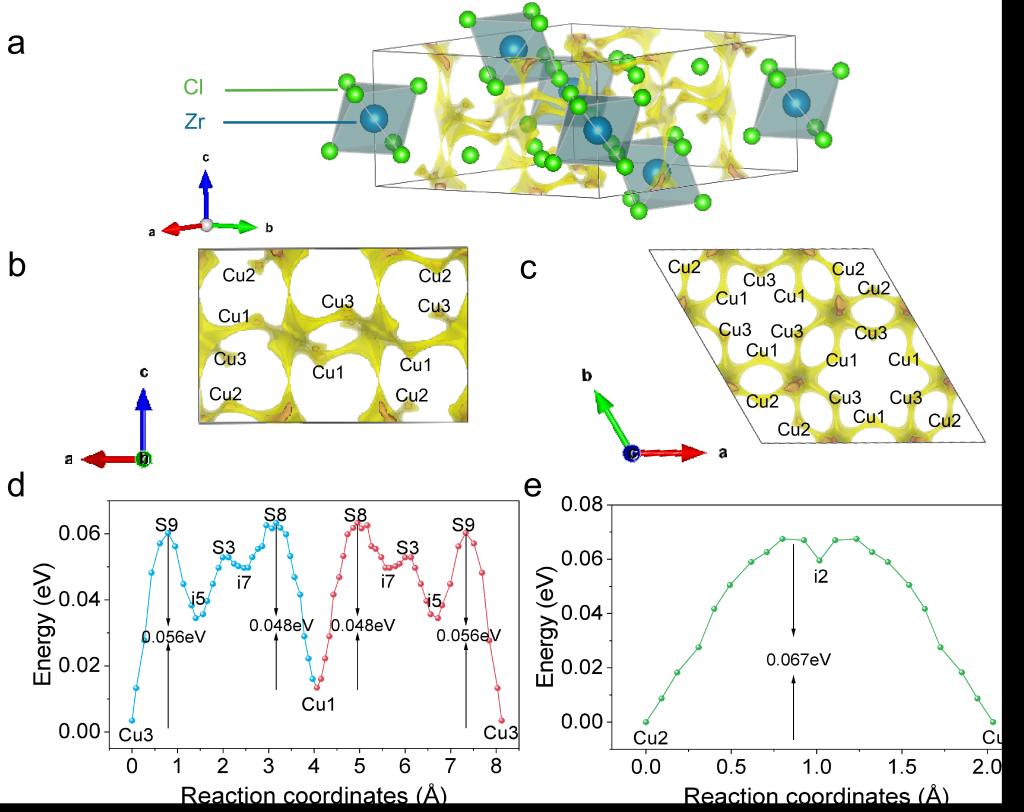 本研究合成了高离子导的亚铜离子卤化物固态电解质并设计构建全固态锂铜电池,以实现全固态锂铜电池的应用。使用机械化学法制备Cu2ZrCl6卤化物固态电解质,其室温铜离子电导率 14 mS cm-1,且铜物种溶解度优异。BVSE表明,Cu⁺Cu2ZrCl6晶体结构中存在多维度的迁移通道,并具有非常低的迁移能垒,有利于快速的离子传输。