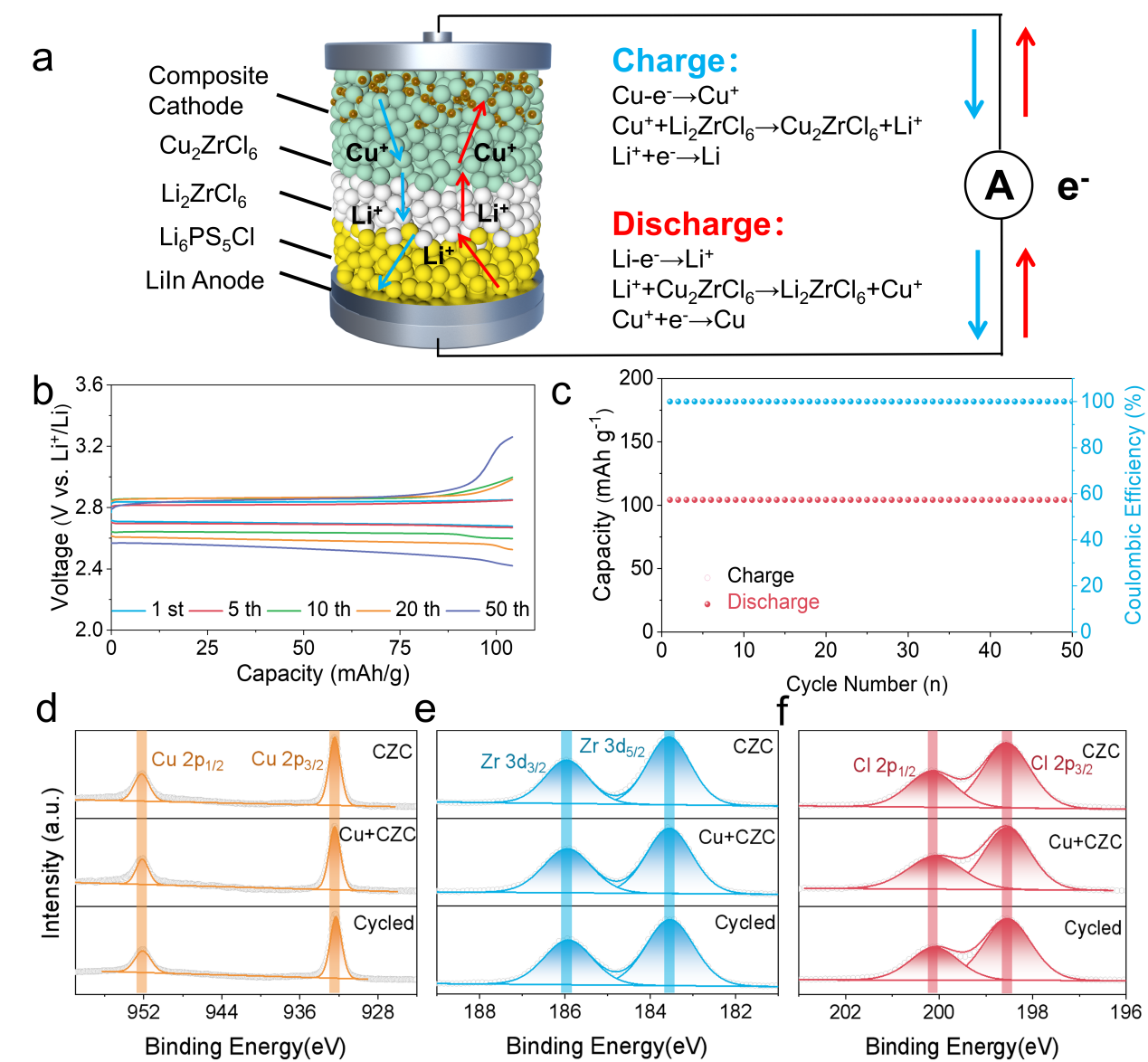 铜铜对称电池在 0.1 mA cm-2条件下,可稳定实现铜离子沉积/剥离超过1000 小时。此外,该工作构建了Cu2ZrCl6Li2ZrCl6电解质中锂/铜离子协同迁移交换模型,首次组装全固态锂铜电池,在对锂 1.7-3.8 V 电压区间、37 mA g-1流下,全固态锂铜电池的可逆比容量高达 360 mAh g-1,并在62.5 mA g-1 下实现50 次稳定循环。更重要的是,还设计了无正极全固态锂铜电池原型,以铝箔为集流体实现纯铜的沉积与溶解,为亚铜离子导体的设计和应用提供新思路,奠定全固态锂铜电池研究基础。