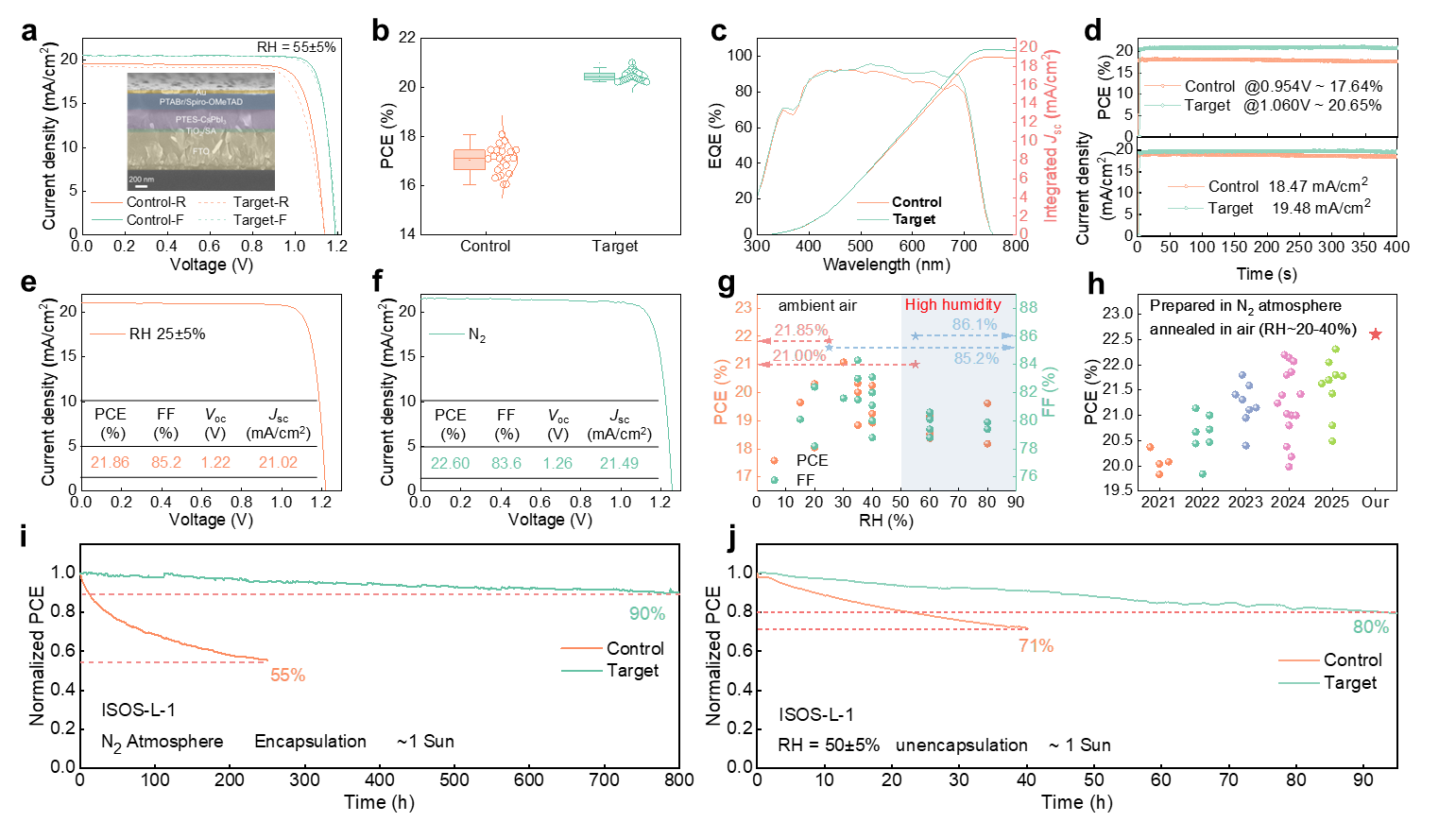 在器件性能方面,在55%相对湿度空气条件下制备的CsPbI3太阳能电池实现21.00%的光电转换效率,填充因子高达86.1%,创下该体系报道中的最高FF纪录。在更低湿度(25% RH)条件下效率提升至21.85%;旋涂于氮气环境、退火于空气中的器件最高效率达22.60%,经认证效率为22.02%。同时,PTES处理器件在连续光照800小时后仍保持90%以上初始效率,在50%湿度空气中未封装器件亦表现出显著优于对照组的运行稳定性。