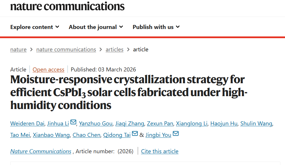 近日,太阳成集团tyc33455李金华、王贤保教授团队在国际顶级期刊《Nature Communications》发表题为《Moisture-responsive crystallization strategy for efficient CsPbI3 solar cells fabricated under high-humidity conditions》的研究成果。太阳成tyc33455cc为第一单位,2022级硕士研究生戴维德仁为论文第一作者,太阳成tyc33455cc李金华教授、武汉大学台启东教授、中科院半导体研究所游经碧教授为共同通讯作者。