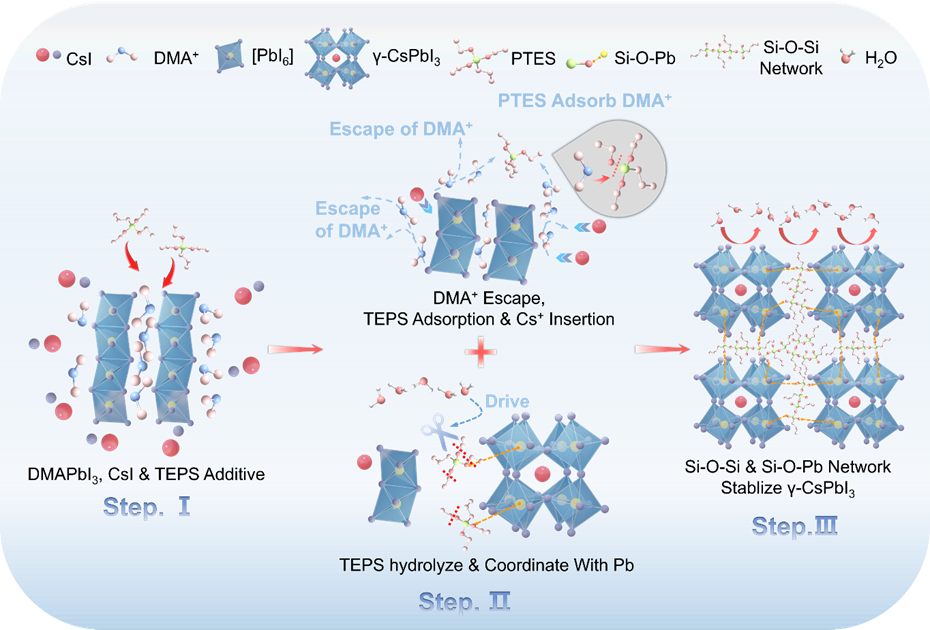 针对这一问题,本研究引入丙基三乙氧基硅烷(PTES)作为多功能添加剂,构建湿度响应型原位交联网络。在高湿空气中,PTES可水解生成Si–OH中间体,一方面与DMAPbI3中间相中的DMA+发生优先吸附作用,加速DMA⁺脱附并促进Cs+嵌入[PbI6]4−骨架,显著优化Cs+/DMA+离子交换动力学;另一方面,通过形成Si–O–Si与Si–O–Pb交联结构,对晶格进行原位加固,降低碘空位密度并抑制水分进一步侵入,实现“利用湿度而非对抗湿度”的结晶调控机制。